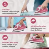 - Built-in self-cleaning system prevents lime scale build-up by flushing impurities out of the steam vents. This feature keeps the iron’s performance intact, prolongs its lifespan, and guarantees long-term efficiency without frequent maintenance worries.