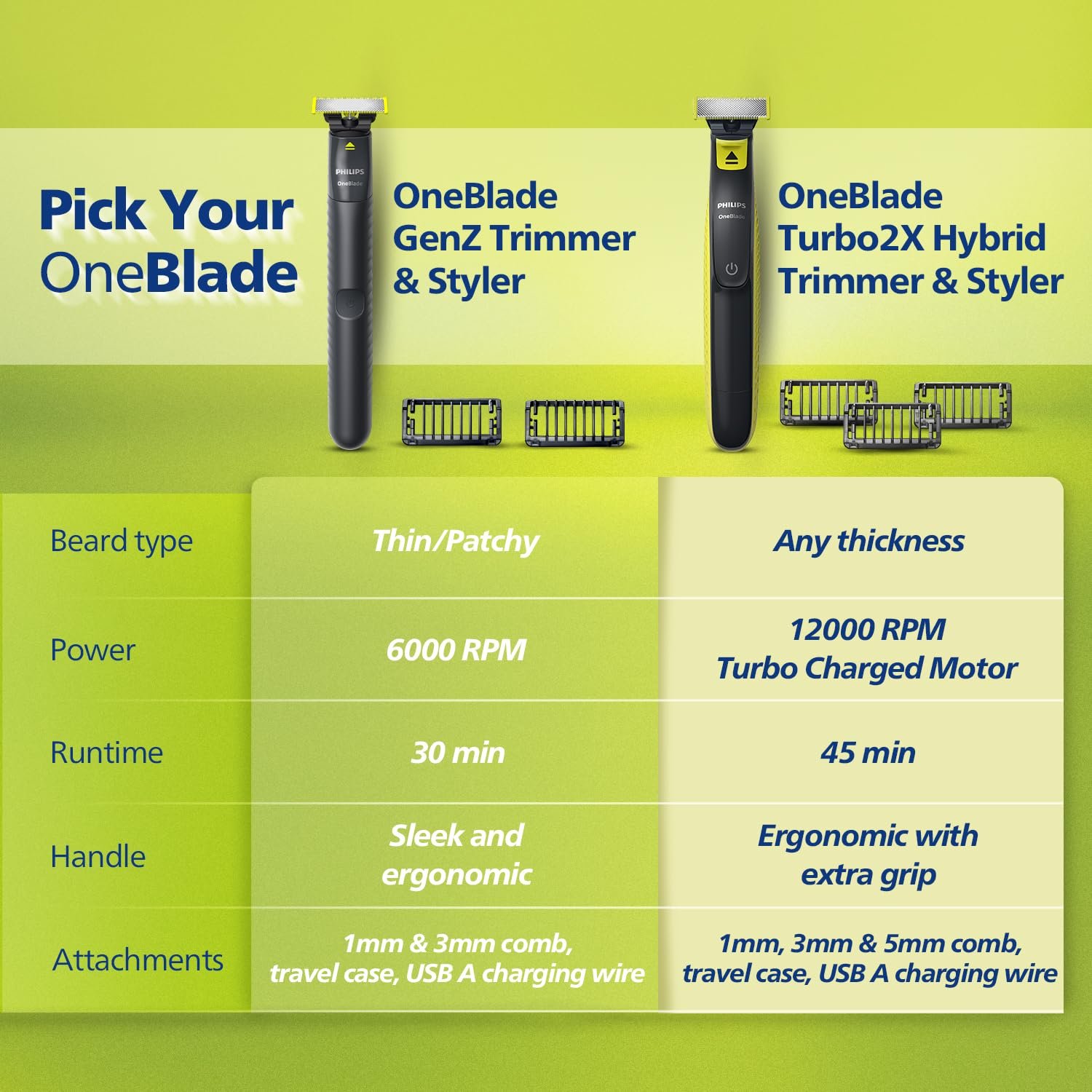 - Philips OneBlade has a revolutionary technology designed for beard grooming. It can trim, Style and also shave any length of hair (Does not shave as close as manual razors as blade doesn’t touch skin). Its dual protection system – a glide coating combined with rounded tips – makes the experience easier and comfortable. OneBlade is powered by a turbo charged cutter (12000x per min) so it’s efficient – even on longer hairs.