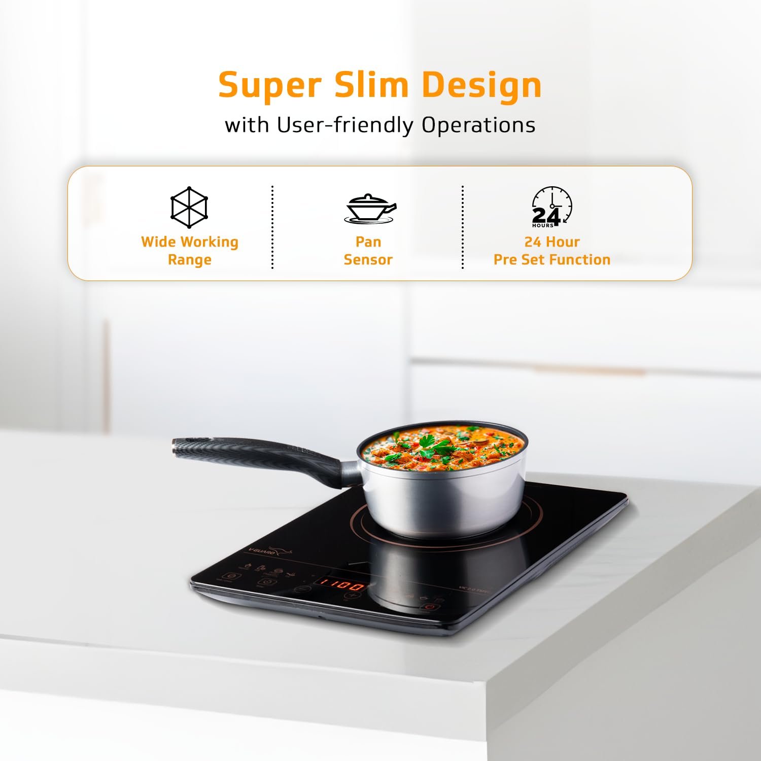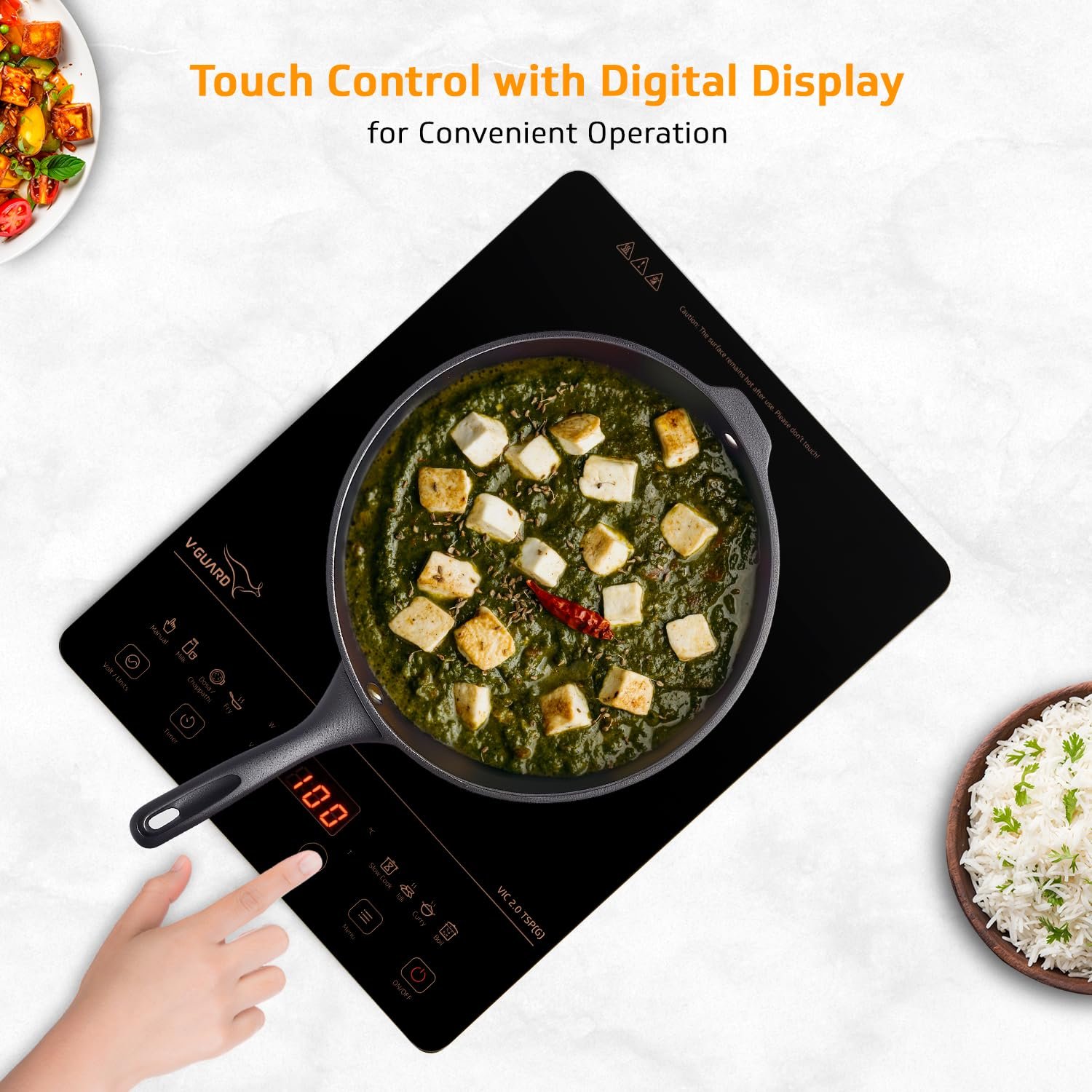 • Touch Panel Control: This V-Guard Induction cooktop comes with a touch panel control for more convenient and effortless usage.