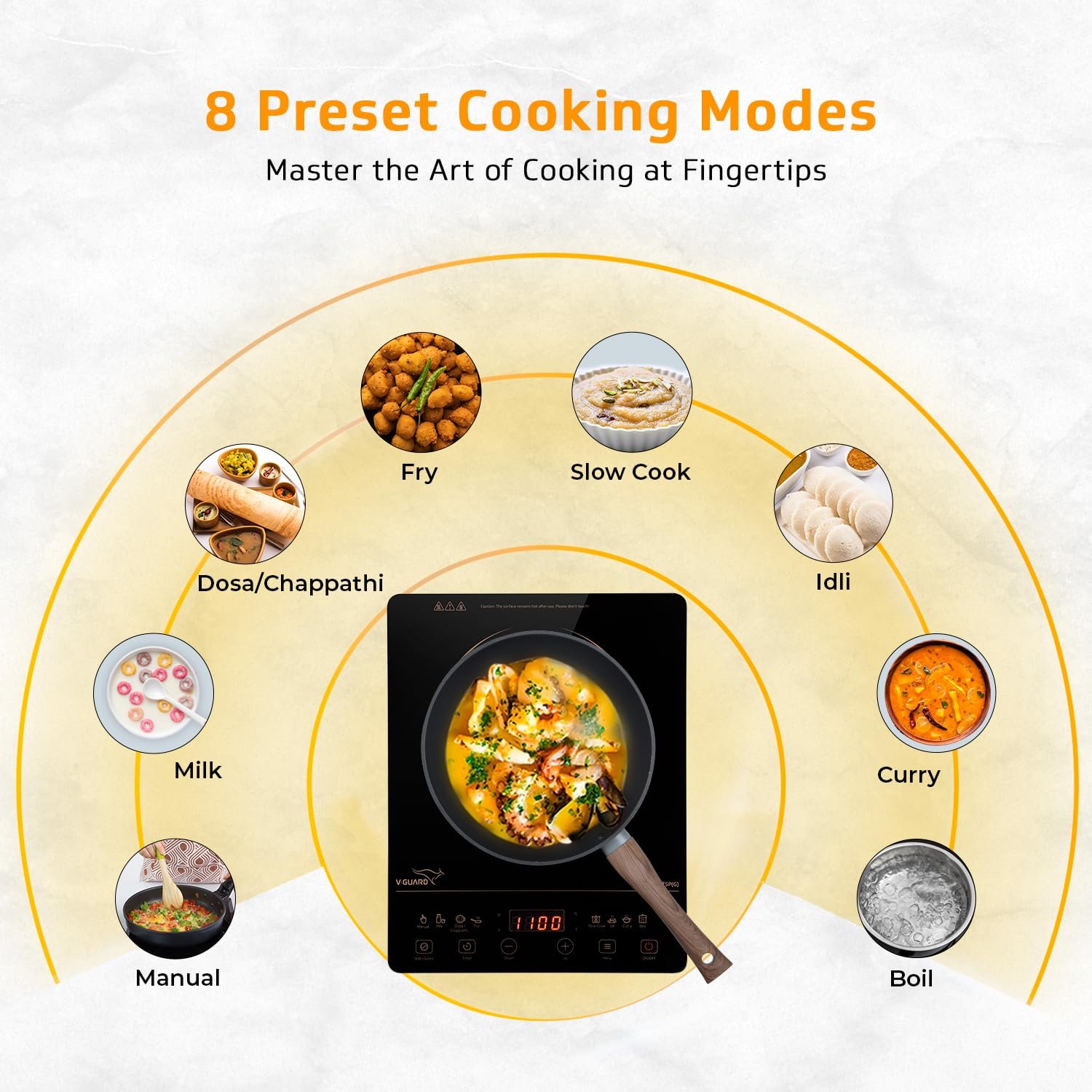 • 10 Power and Temperature Modes: This V-Guard Induction cooktop comes with 10 power (300W 2000W) and temperature modes (60°C-240°C), specially designed for Indian cuisines so that every dish gets the perfect heat for the perfect taste.
