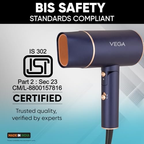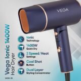 Details: The Vega Ionic 1400 Watts Hair Dryer comes with advanced Ionic Technology that helps seal hair cuticles, lock in moisture and reduce frizz to deliver smooth, shiny results. The blow dryer for women and men is engineered for ultra-fast drying, ensuring efficient performance. With 2 Speed/Heat Settings, the dryer machine for hair smartly combines high-velocity heated and ionized air to dry hair quickly while maintaining moisture balance. This is a hair dryer with cool air setting wherein the Cool Shot Button lets you set your hairstyle with a burst of cool air, giving long-lasting hold. The Vega hair dryer is equipped with a Dual-Layer Concentrator that helps regulate temperature and airflow for precise styling, as well as a Removable Double-Layer Back Filter Cover for easy cleaning and maintenance. The hair blower also comes with a Foldable Handle, which makes it compact and travel-friendly to style at home or on the go.